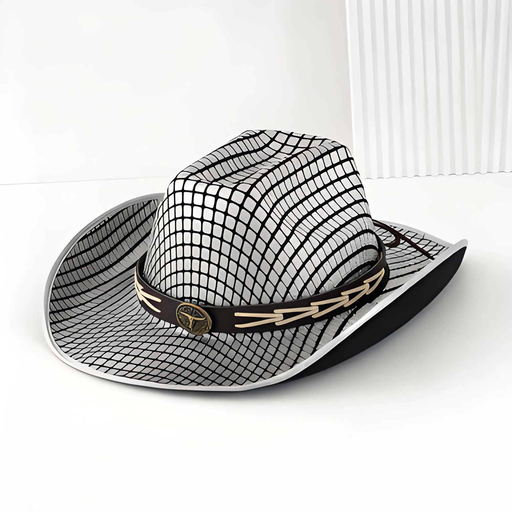 Cowgirl Hats for Women and Men Western Rolled Wide Brim Net Print Fedora Jazz Hat with Bull Head Decorative Belt